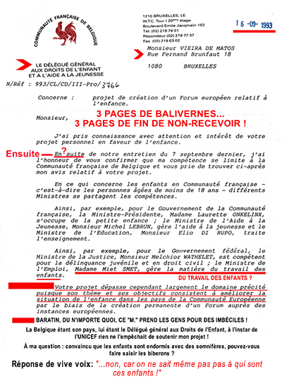En revanche, bizarrement, M. Claude Lelievre* (PS), alors Délégué général aux Droits de l'Enfant ainsi que l'Eurodéputée Raymonde Dury (PS), *a *déclaré par écrit, dont 3 pages de fin de non-recevoir: "Lettre" ci-dessous.
