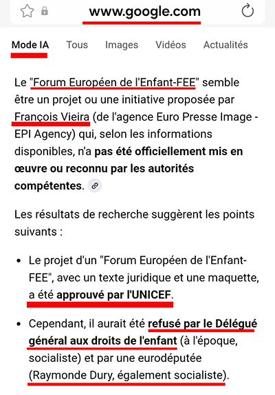 Or, d’abord, selon l'IA, le Forum Européen de l'Enfant-FEE était "une série d'événements et de réunions thématiques organisés par la Commission européenne. Ces rencontres visent à promouvoir les droits de l'enfant et à élaborer des stratégies pour améliorer leur bien-être au sein de l'Union européenne". Cette information de l'IA était FAUSSE, ARCHI FAUSSE.