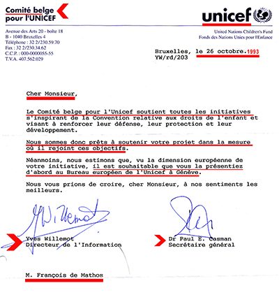 La Belgique étant son pays, lui étant le Délégué général aux Droits de l'Enfant, à l'instar de l'UNICEF RIEN ne l'empêchait de soutenir mon projet !