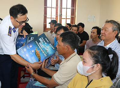 Le Commandement de la Région 2 de la Garde côtière vietnamienne distribue des dépliants de sensibilisation sur la lutte contre la pêche INN aux pêcheurs. © Dinh Huong - VNA