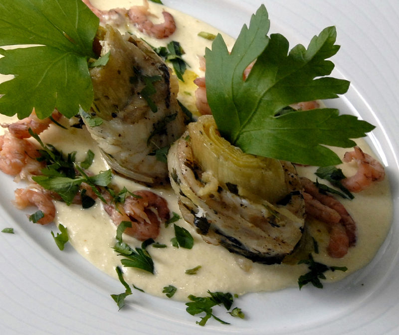 Filets de sole en roulade, poireau, crevettes grises sur lit de raifort et crème fraîche.