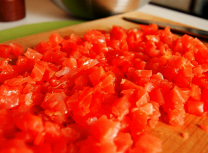 Dans une large casserole mi-profonde, versez 5 cuillères à soupe d’huile d’olive extra-vierge, 50 gr de beurre, 25 cl du court-bouillon (fumet de base), la chair de 4 tomates (sans peau ni pépins), les poivrons coupés dans le sens de la longueur, les échalotes achées finement, l’ail et une cuillère à café de pili-pili. Laissez mijoter à petit feu jusqu’à ce que les tomates aient fondu complètement. Terminez en y ajoutant encore 25 cl de court-bouillon chaud.