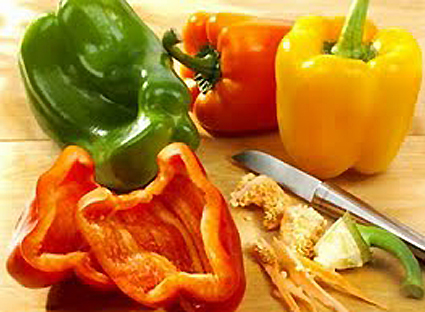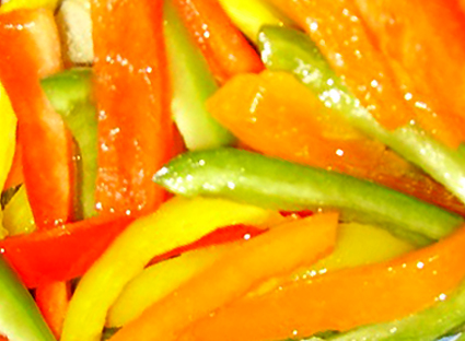 Présentation à table (premier service): placez au centre de l’assiette quelques pommes de terre (utilisez des assiettes larges et creuses). Sur les pommes de terre placez les languettes des poivrons (rouge, vert et jaune) en forme d’étoile. Au centre de l’étoile, placez une petite branche de coriandre ou de persil.