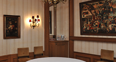 À l’origine, l’espace occupé aujourd’hui par la Brasserie de l’Ommegang était le salon d’accueil et le bar de La Maison du Cygne* (*Hélas, fermée). Lors de sa rénovation, les éléments décoratifs principaux ont été gardés : lambris, plafond à caissons, cheminée. Tableaux et mobilier contemporain apportent une touche dynamique sobre et élégante aux lieux pour y créer une ambiance à la fois feutrée et décontractée.