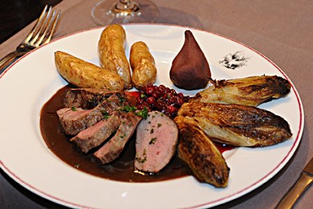 Aujourd’hui, invité VIP de la Brasserie de L’Ommegang, son choix s’est porté sur le magret de canard en entrée, suivi d’une sole limande avec pommes de terre vapeur et légumes, comme dessert une crème brulée. Puis, café et digestif. Apéritif et vins : coupe de champagne, Pouilly-Fumé (blanc), et Petit Bocq (rouge).